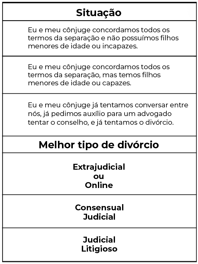 Para maior facilitação trouxemos uma tabela abaixo para você ter uma noção de qual o melhor tipo de divórcio para o seu caso.